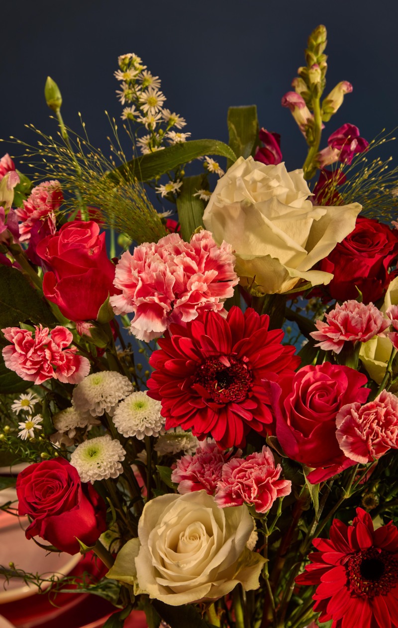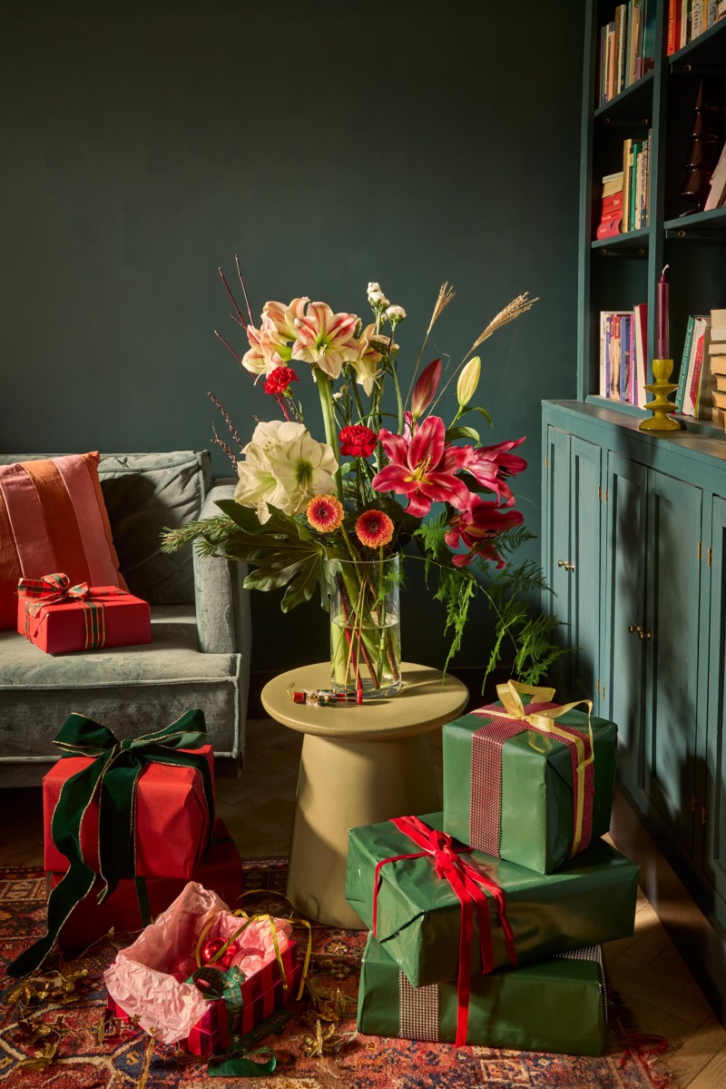 De feestdagencollectie bevat boeketten met amaryllis, lelies, anemonen en tulpen in zowel traditionele als eigentijdse kleurstellingen. Het Feast boeket is terug in een klassieke en extra feestelijke variant voor de gedekte kersttafel.