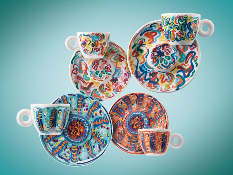 Sol Calero – geboren in Caracas, woonachtig in Berlijn – staat bekend om haar installaties waarin schilderkunst, volksarchitectuur, textiel en mozaïek samenkomen. Voor illy creëerde ze een serie espresso- en cappuccinokopjes met florale patronen, felle kleuren en geometrische motieven. Elk kopje is een uitnodiging om te vertragen, te kijken én in gesprek te gaan.