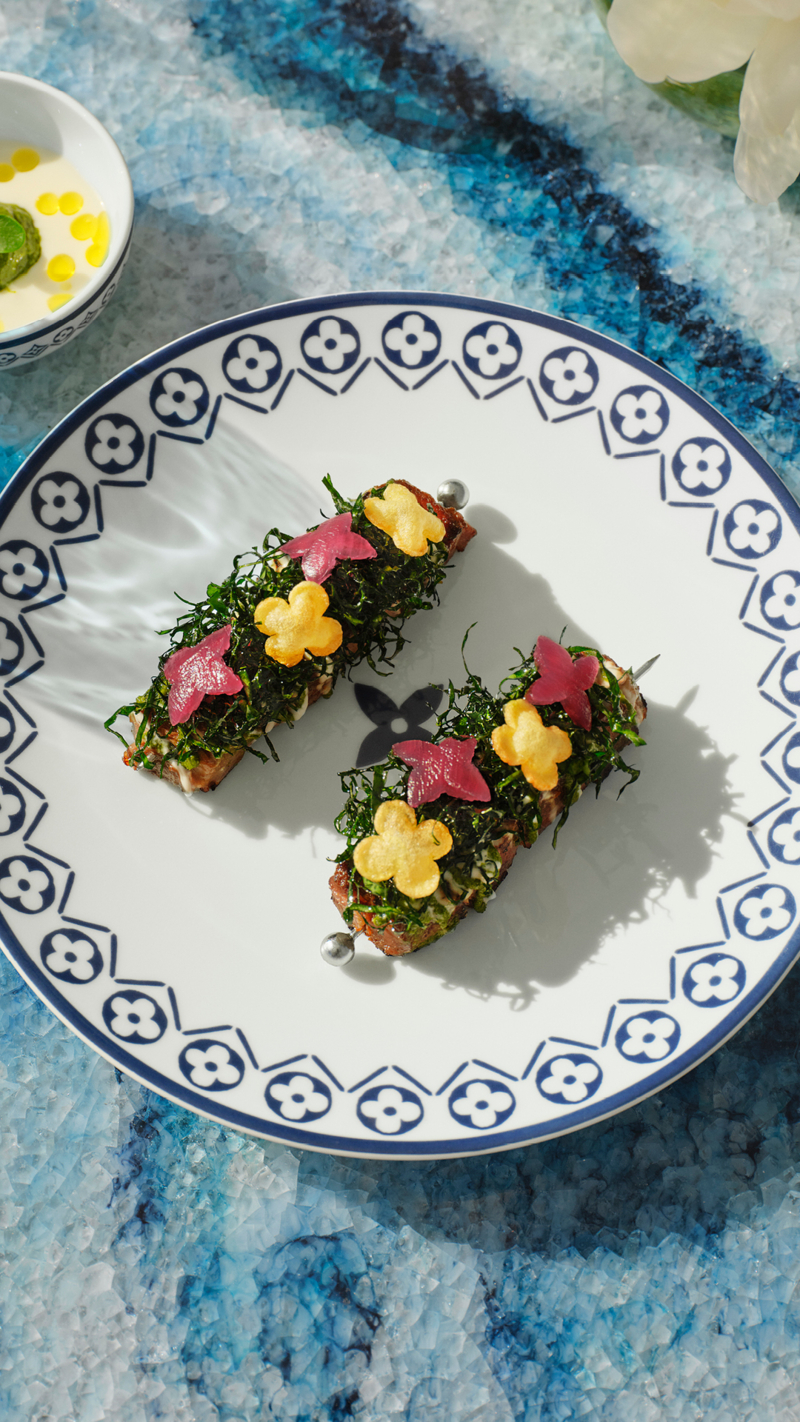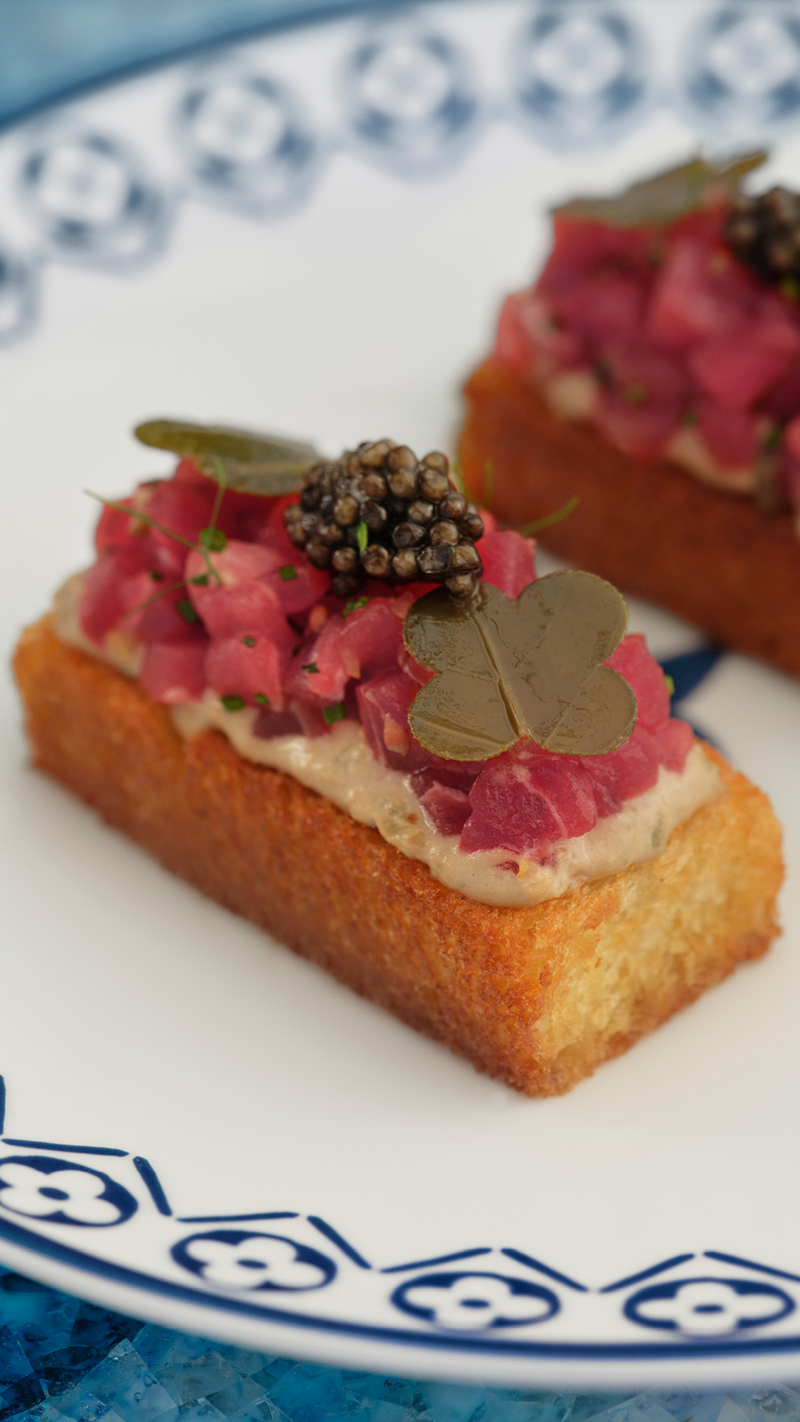 Tonijnbruschetta, geserveerd op het exclusieve Monogram Flower Tile-servies