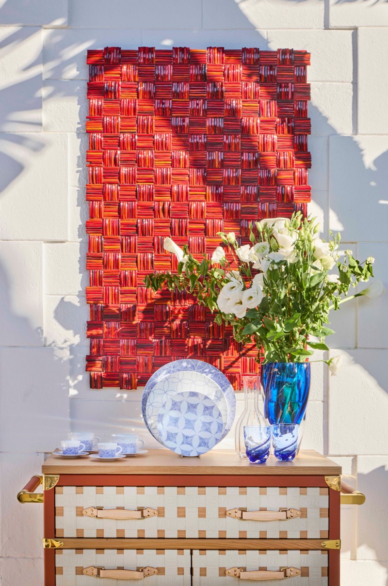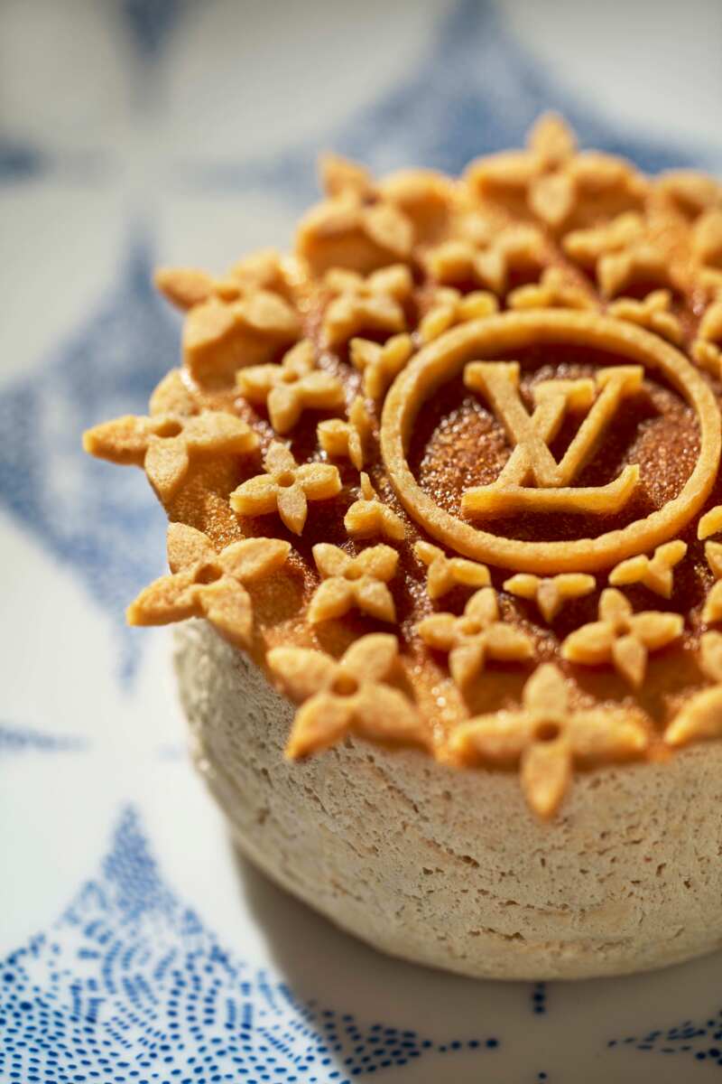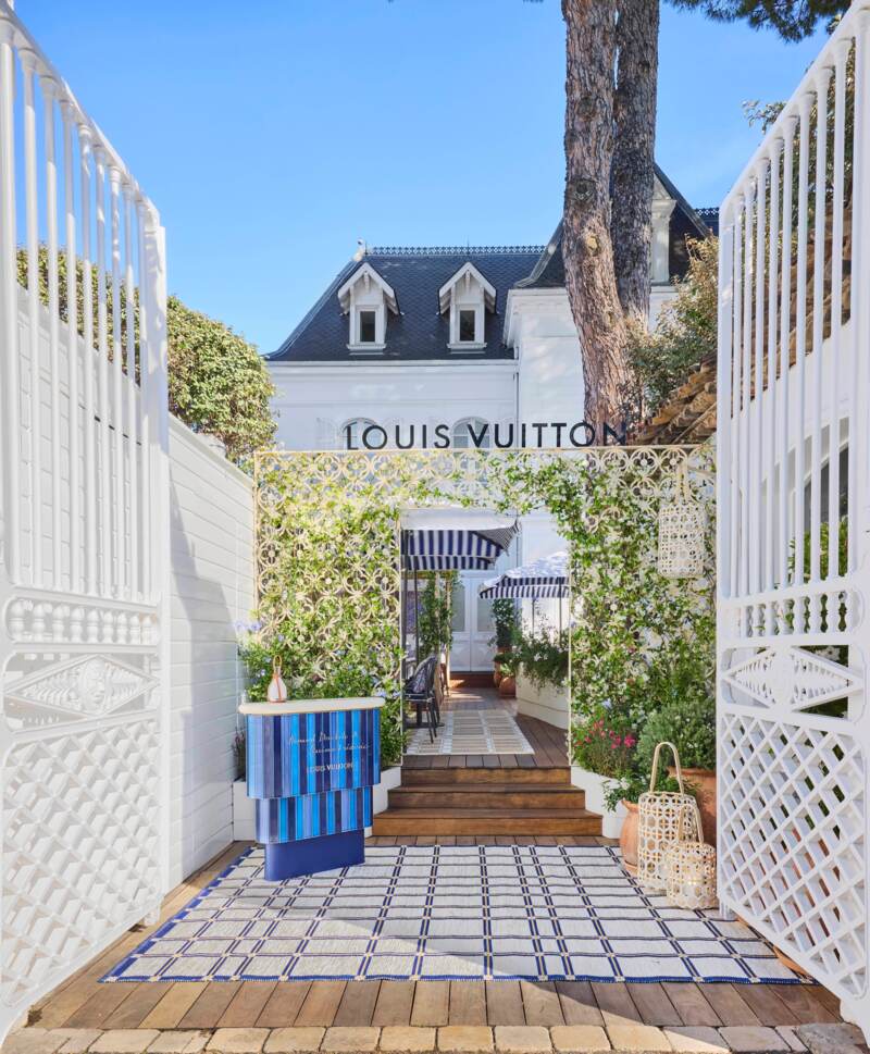 Het restaurant in Saint-Tropez vormt een zintuiglijke beleving waarin gastronomie, design en mode naadloos samensmelten. Het servies is afkomstig uit de nieuwe Constellation-collectie: porselein van Limoges in extra-wit met een geometrisch patroon dat de iconische Monogram Flowers herinterpreteert. De tafels zijn aangekleed in een bloemrijke print die ook terugkomt in de Louis Vuitton Women’s Resort 2025 collectie, terwijl designlampen van Objets Nomades – waaronder de Mini Bell Lamps van Barber & Osgerby – zorgen voor een warme, intieme sfeer.
