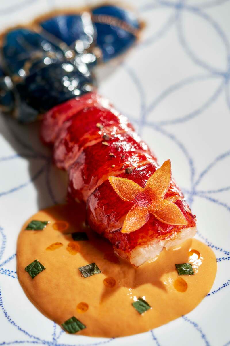 Seizoensgebonden ingrediënten worden met wereldwijde invloeden gecombineerd. Zo krijgt Wagyu beef een Franse twist met pot-au-feu-aroma’s, en wordt tonijn gepresenteerd met Aziatische finesse. Mediterraanse kruiden, lokaal geteelde bloemen en zelfs blauwstaartkreeft met shiso-saus onderstrepen de focus op zowel terroir als reislust.