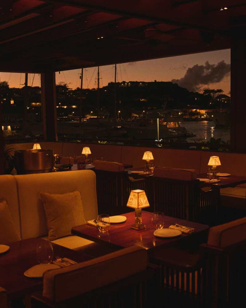 De Rooftop opent rond het gouden uur. Natuurlijke materialen, warm licht en tropisch groen creëren een nonchalant elegante sfeer met uitzicht over de haven van Gustavia.