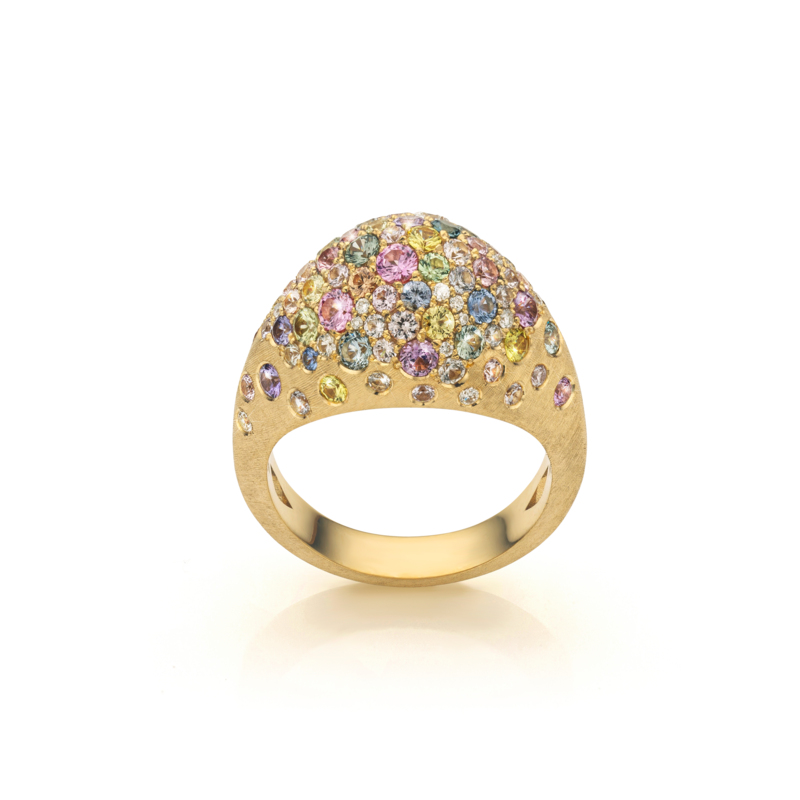 - 18k geelgouden ring Waterlelies met groene en roze toermalijn. Bij Narciss Fine Jewellery. - Armband Manchette Mirus van cornaline en diopsides. Bij Studio C Paris. - 18k geelgouden schakelarmband. Bij Tove Rygg. - 18k geelgouden ring van Chanel met Citrien, Peridot en Ioliet. Frankrijk, eind jaren 1980. Bij The old Treasury – Laura Schmitz Fine Jewelry. - Ring bombé van Cartier. 18k geelgoud, platina, diamant (ca. 2,75 caraat) en saffier (ca. 3,25 caraat). Frankrijk, ca. 1965. Bij Polann’s Amsterdam. - 18k geelgouden ring met 144 stenen, no heat saffier en enkele diamant. Florentine finish, bovenop snowflake gezet, enkele flush gezette stenen aan de zijkanten. Bij Eve Sparkles.