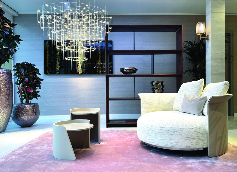 De Lorelei fauteuil en sofa uit de Maserati edition door Giorgetti bieden een opvallende mix van eigentijds design en luxueus comfort. In dezelfde setting voegt de Floria tafel ontworpen door Pierre-Yves Rochon een sculpturale en verfijnde tegenhanger toe